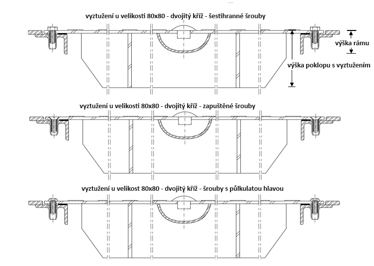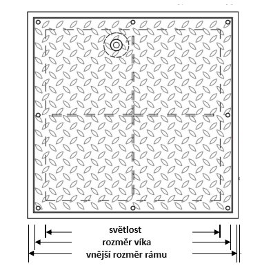 F 5 = 5 t mez pevnosti - pro vozidla do tlaku kol cca 1,25 t • žárově zinkovaná ocel • čtyřstranná podpěra s kotvami • těsnění z pěnové pryže EPDM v rámu, kryt s vodotěsným zvedacím otvorem • vodotěsné proti "denní vodě" - voda, která nemá tlak • dva otvory o průměru 18mm jako zvedací otvory • navařené výztuhy do kříže - do velikosti 70x70 - jednoduchý kříž, u větších rozměrů dvojitý kříž, do velikosti 40x40 bez kříže • šroubované nerezovými šrouby (do 50x50 4 - od 60x60 8 - od 100x100 12 kusů) se šestihrannou hlavou SW 13 - na vyžádání bez příplatku ISO 7380 s půlkulatou hlavou a vnitřním šestihranem nebo DIN 963 nebo DIN 7991 se zápustnou hlavou. • výška rámu cca 4cm, s výztuhami cca 9cm • standardní rozměry i možnost výroby atypických rozměrů na zakázku Doplňky k poklopům za příplatek: vrchni panty, spodní panty, plynové pružiny, rukojeť - volná, navařená, zápustná